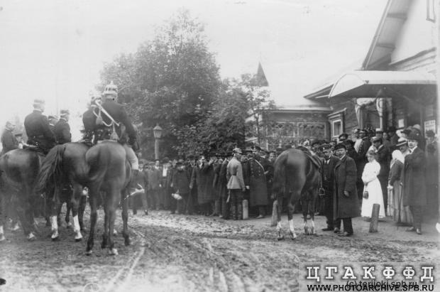 - ↑ Фотографии из Центр.гос. архива фоно-, фото- и кинодокументов (ЦГАФФКД). «Охрана и жители города у дома, где жил М. Я. Герценштейн. 1909 год»: Фото 1, Фото 2